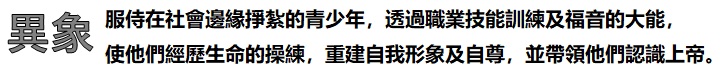 目標對象為戒毒、刑釋、隱青及邊緣青少年,以提供車身噴油及車身美容的在職訓練,並提供工作見習職位。